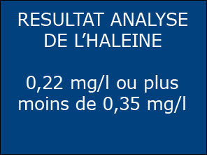 ![]() | Le résultat est d'au moins 0,22 milligramme mais de moins de 0,35 milligramme d'alcool par litre d'air expiré: